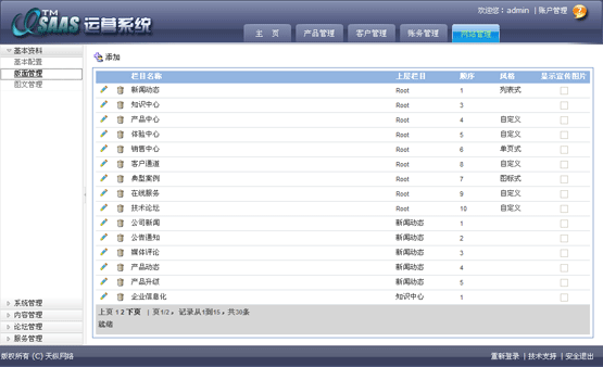 运营商后台主界面。管理产品、客户、费用,设置网站。