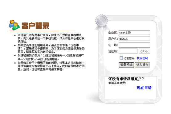 客户登录租用系统界面。可在后台做好设置直接登录到租用系统上。
